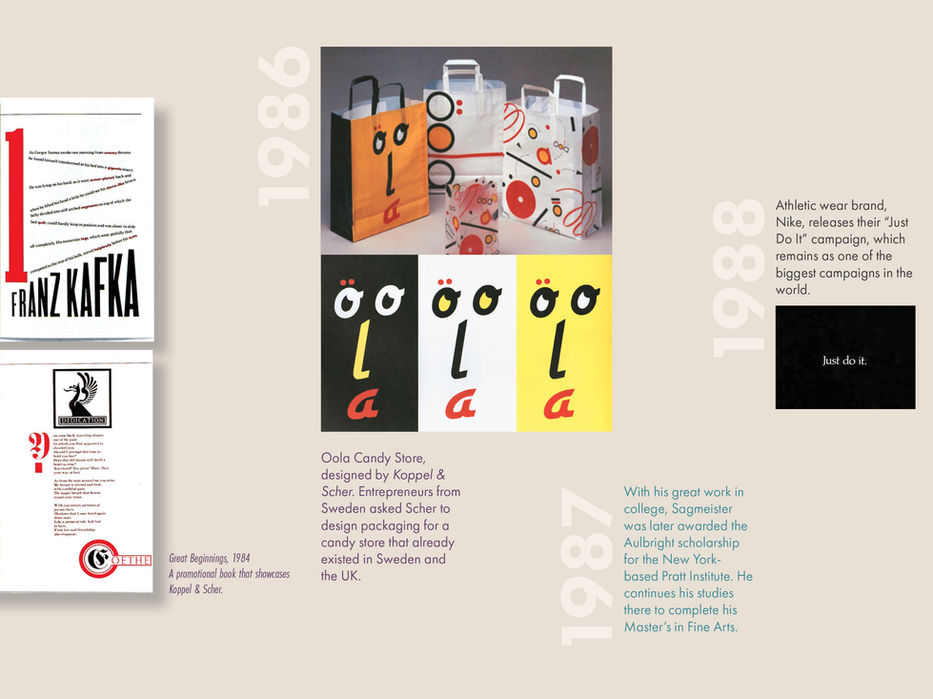 The Two Designer Timeline was a project proposed in my History of Graphic Design class, where each student was assigned two designers to research, gather material and assemble an accordion book. My timeline followed the lives of the inspiring designers, Paula Scher, and Stefan Sagmeister. Simultaneously while taking a dive into their lives, we were also assigned to research relevant historical events that were happening over the same time period. In this project, I challenged my typography skills greatly in creating an organized yet stylistic book, which also represented Scher and Sagmeister's design choices.